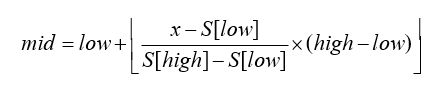 mid = low + floor(((x – S[low])*(high – low))/denominator); //low, high와 x의 비율을 통해 mid 갱신