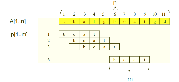 if(p[1..m] == A[i..i+m-1]) matching is found at i