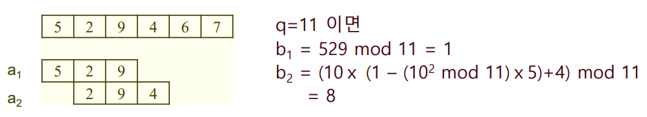 - b_i = (dⅹ(b_i-1- (d^m-1 mod q)ⅹA[i-1]) + A[i+m-1]) mod q