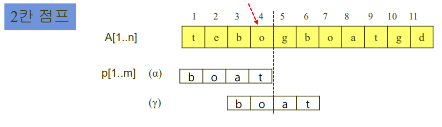 ✓ 총 매칭 시간: O(mn). 그렇지만, 점프를 크게크게 하기 때문에 A의 길이인 n만큼 다 보지는 않고 빨리 진행됨