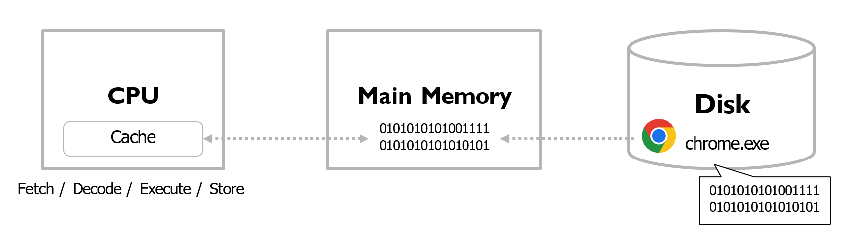 실행(클릭) → disk에서 main memory로 프로그램이 올라감(복사) → cpu가 메모리로부터 instruction들을 한줄씩 불러서 처리함