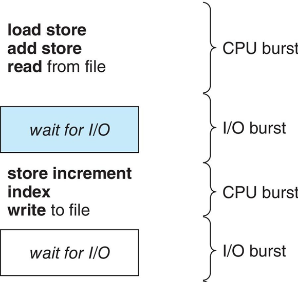 프로세스 실행되면 CPU를 쓰는 시간(CPU burst) 및 I/O를 대기하는 시간(I/O burst)이 번갈아가면서 일어난다.