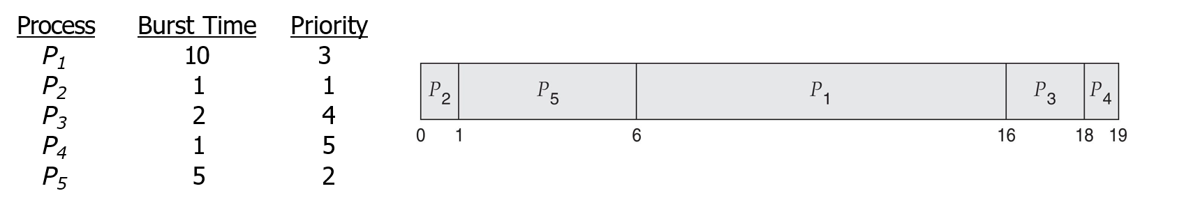 starvation이 발생 가능하다. 공평하지 못하다! : 우선순위가 낮은 프로세스가 존재할텐데, 계속에서 높은 우선순위를 가진 프로세스만이 ready queue에 도달하면 낮은 우선순위를 가지는 프로세스가 계속 실행을 못하게 될 수도 있다. ⇒ 해결 방안 :Aging → 우선순위가 낮은 프로세스의waiting time이 커질수록우선 순위를 올려준다.