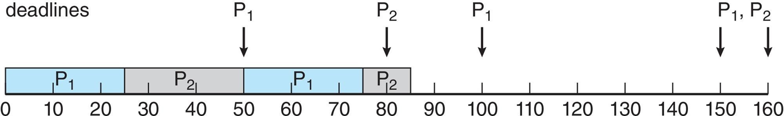 처음 P1과 P2가 들어왔을 때, P1이 주기가 짧으므로(=rate가 높으므로) P1을 먼저 스케줄링해준다. 20초간의 스케줄링이 끝나면 P2가 스케줄링된다. P2가 스케줄링 되는 도중 50초에 P1이 들어오게 되고, P1이 더 rate가 높으므로 P1이 preemption해서 스케줄링된다. P1이 끝난 70초에 P2가 마저 스케줄링 된다.