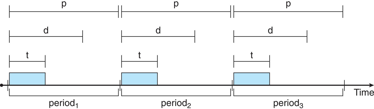 이때 주기를 p, deadline을 d, 프로세싱되는 시간을 t라고 하면, 다음이 성립해야 한다.
