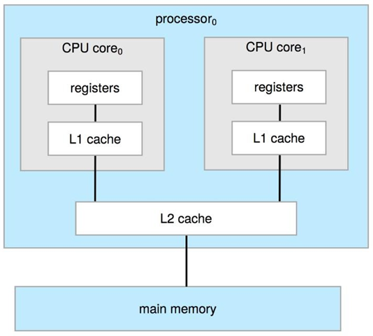 여러 개의 프로세서 코어를 동일한 물리적 칩에 배치하는 것이 최근 추세. → 더 빠르고 더 적은 전력을 소비함.