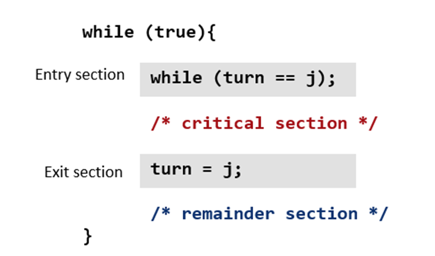 처음에 turn == i라고 하자. 그러면 i 프로세스는 while (turn==j); 에 안 들어가고, 크리티컬 섹션을 실행할 것.