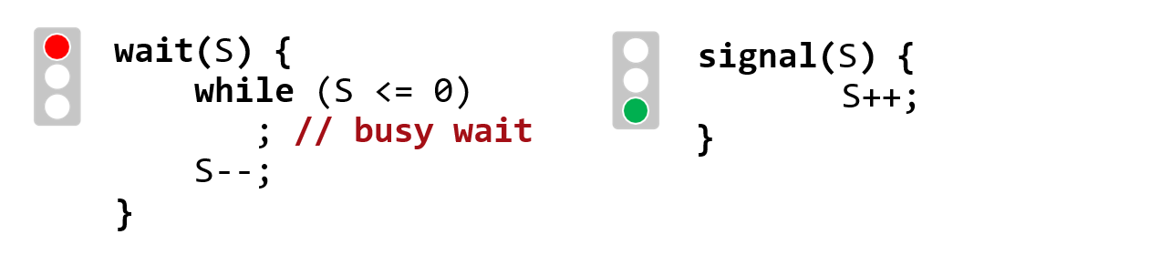 : S가 0보다 커질 까지 기다리고(busy waiting) , S>0이면 S를 1 내린다. - signal()
