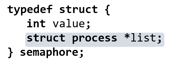 양수인 경우 남아있는 기존 세마포어처럼 남는 자원의 개수를 의미한다. - list는 세마포어를 대기하는 프로세스들의 리스트(linked-list)이다.