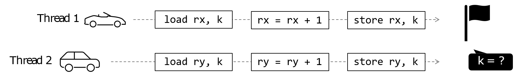 공유 메모리에 저장된 k를 읽어와 +=1을 한 후 저장하는 코드를 스레드1, 스레드2가 있다고 하자.