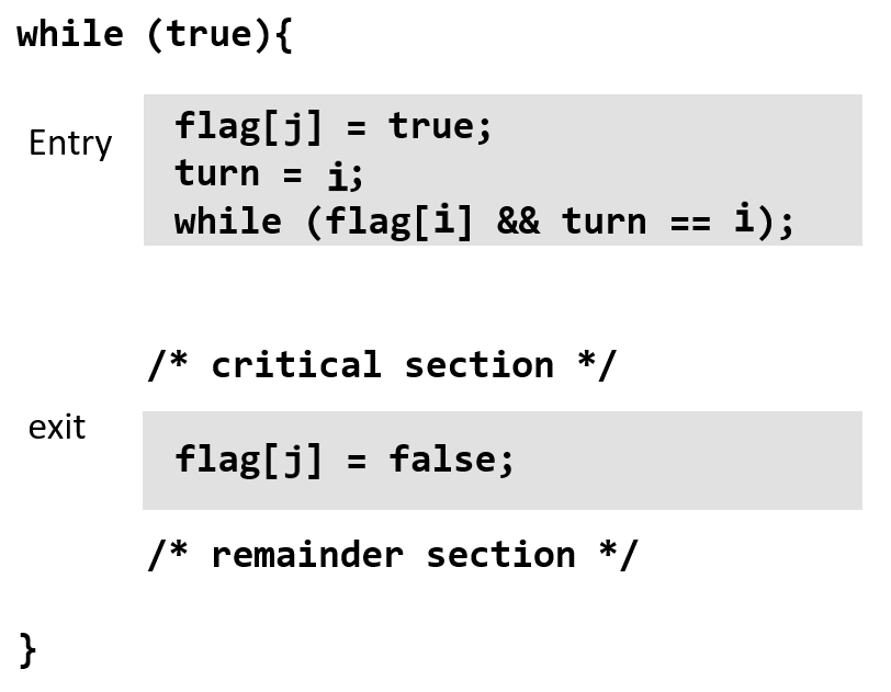 두 flag가 true이더라도, turn은 i또는 j 하나만 가능하기 때문에 동시에 critical section을 실행하는 일은 없음.