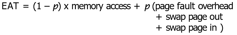- EAT = (1-p)*메모리 접근시간 + p(page fault 오버헤드 + page out 시간 + page in 시간)