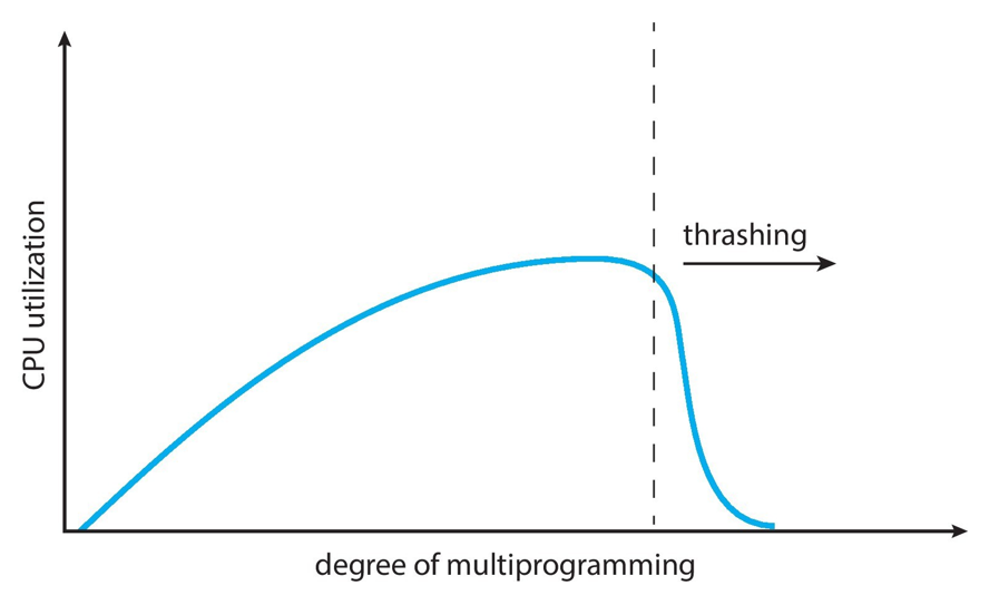 → 그런데 문제는, OS입장에서 CPU burst가 낮아지면, CPU가 별로 일 안하네? 하고 더 많은 프로세스를 넣어버릴 수도 있음. 그래서 Thrashing이 시작되면 상황이 더 악화될 수도 있음.