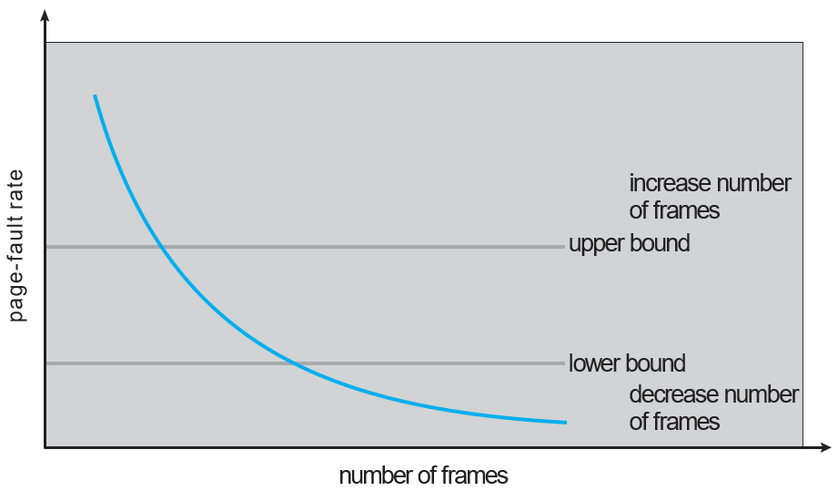 - page fault 비율이 lower bound(하한치)보다 낮으면 메모리가 충분한 거니까 뺏음