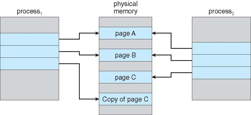 대신 부모와 자식 프로세스가 초기에는 같은 페이지를 공유하는 Copy-on-Write(COW) 기법을 사용하면 됨. 이런 공유 페이지는 COW 페이지로 표기를 해둠. 즉, 父子 중 하나가 공유 페이지에 쓰기를 시작하면 공유 페이지의 복사본이 생성된다는 뜻임.