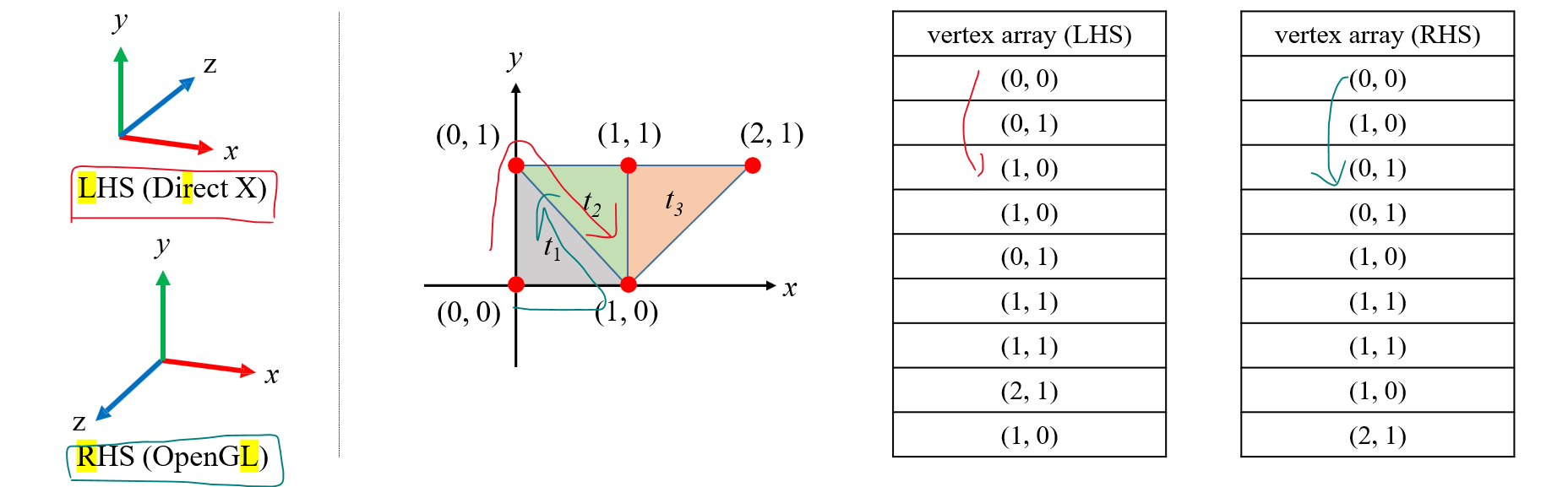 LHS와 RHS는 z값의 방향(엄지손가락 방향이며, 보이는 방향이 됨)이 다름!!