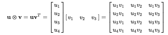 * 벡터 곱(cross product)과 외적(outer product)의 차이!벡터 곱은 벡터로 보고 곱한 것이고, 외적은 행렬로 보고 곱한 것임.따라서 벡터 곱의 결과는 벡터인 반면, 외적의 결과는 행렬이다. [ 벡터곱 ] ![]() ![]() [ 외적 ] ![]() |