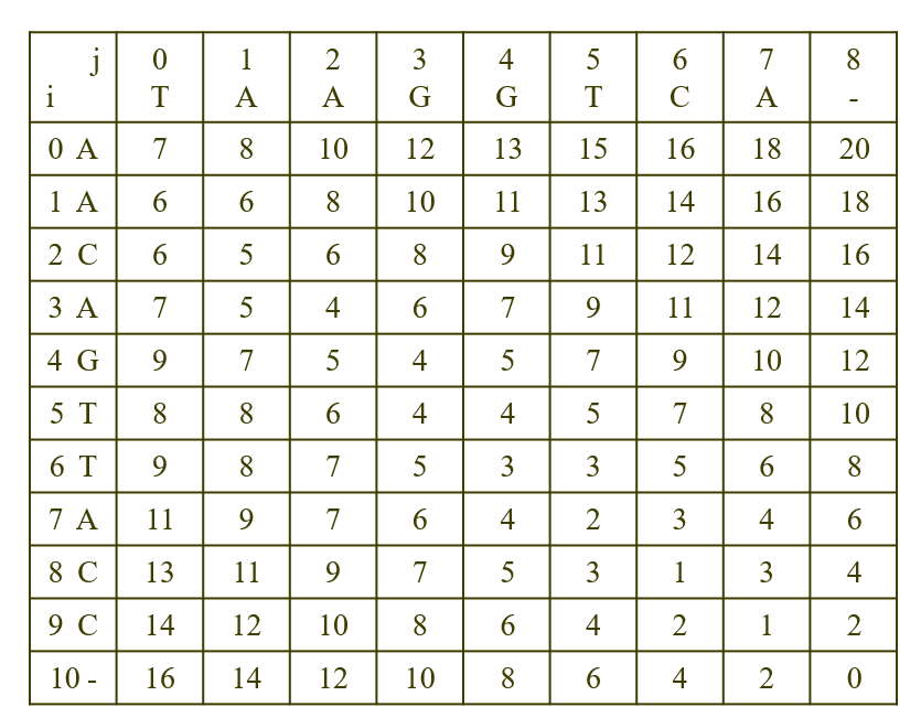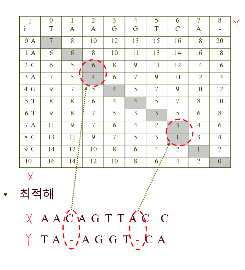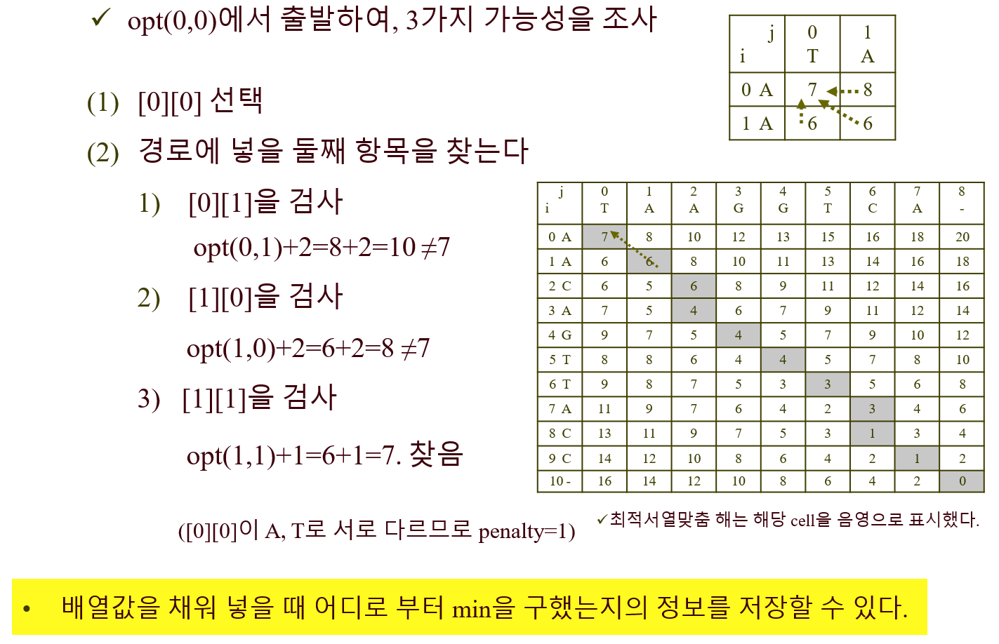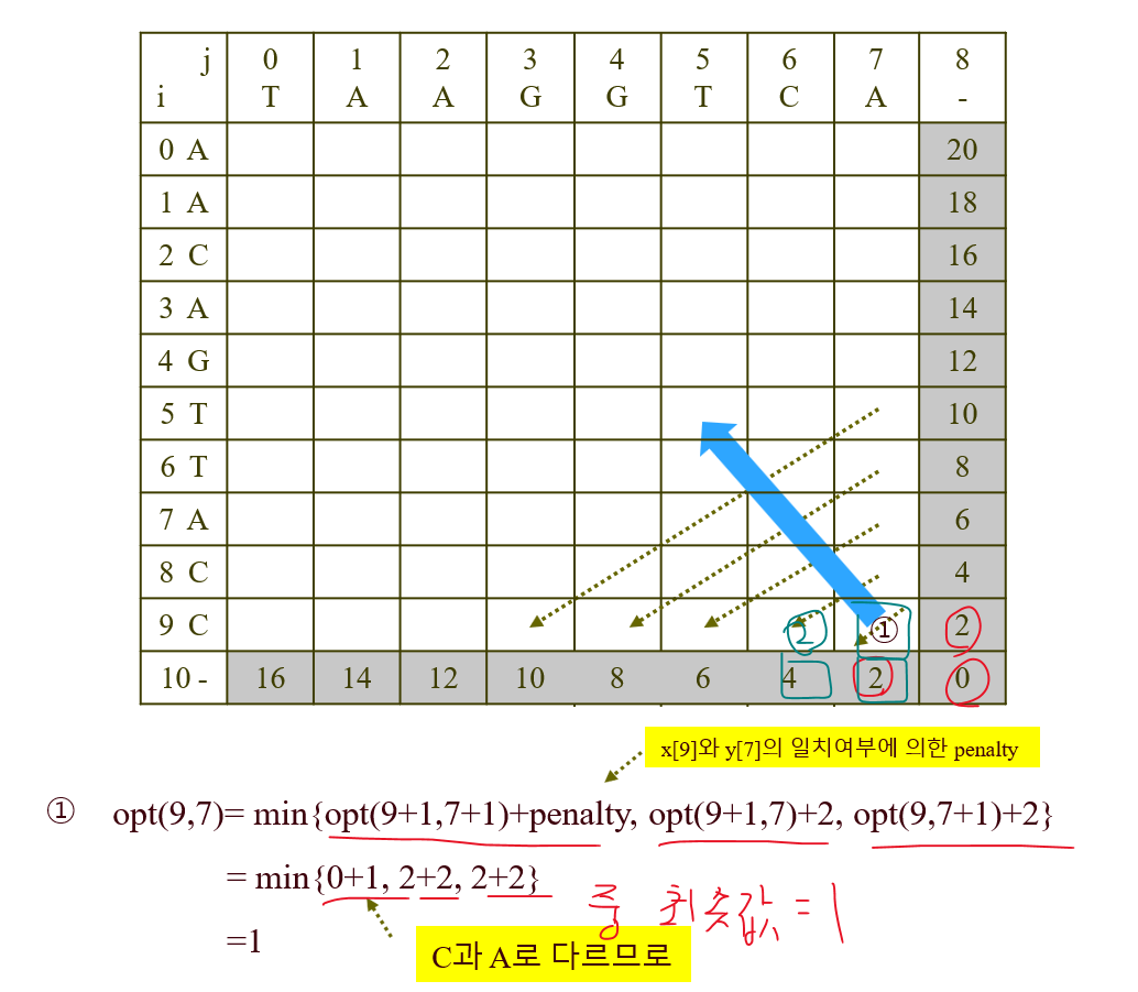 일반식 : opt(i,j)=min(opt(i+1,j+1)+penalty, opt(i+1,j)+2, opt(i,j+1)+2)