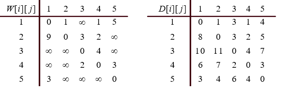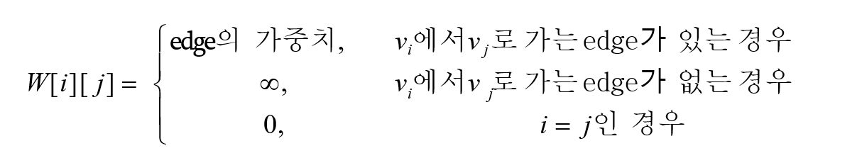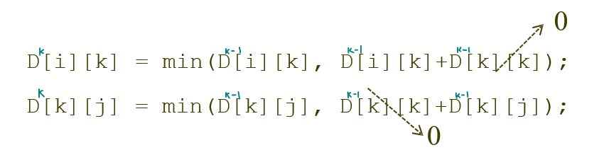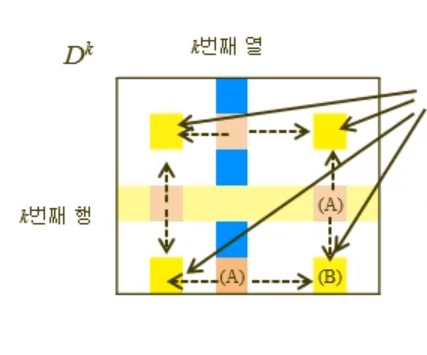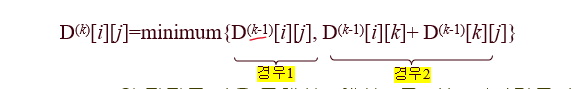 D[i][j] = minimum(D[i][j], D[i][k]+D[k][j]); // k-1번째의 D[i][j] 또는, k를 포험하는 D[i][j]