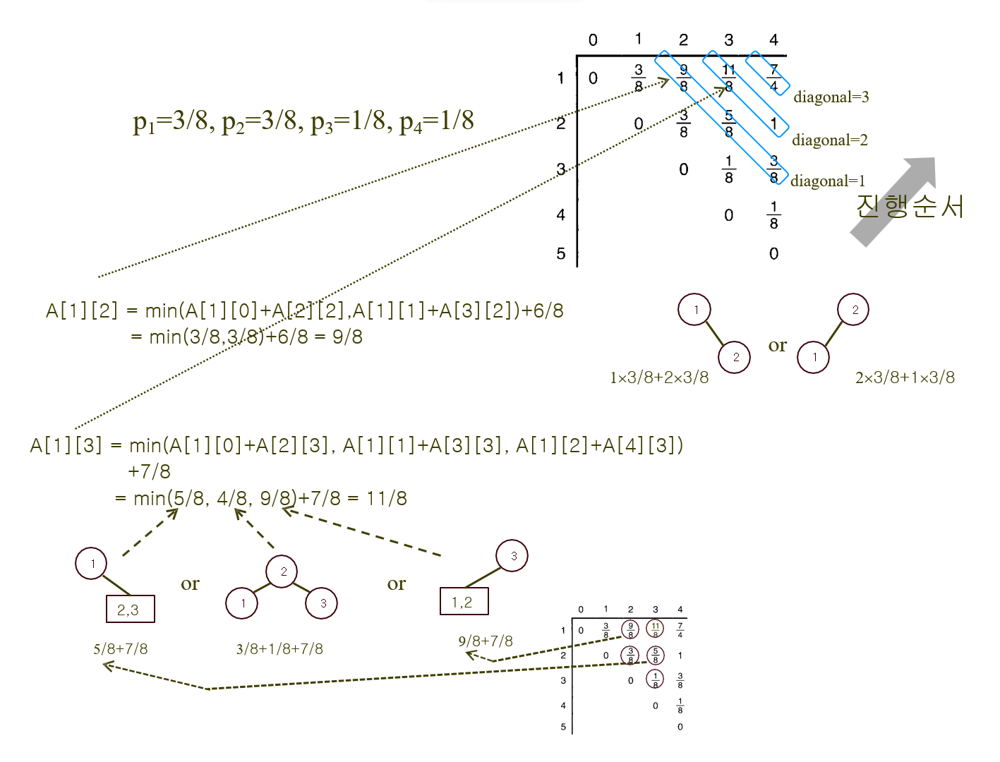 그런 다음, 우측 아래부터 대각 원소들을 채워나가며 작은 문제들부터 푼다.