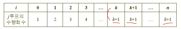 i가 k 이상일 때는 j루프 수행횟수가 항상 k+1번이다.