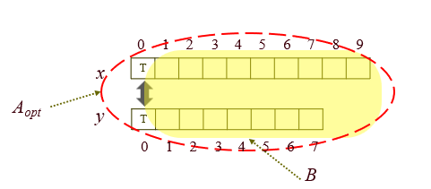 A_opt가 x[0~9]과 y[0~7]서열의 최적 맞춤이라 하자.
