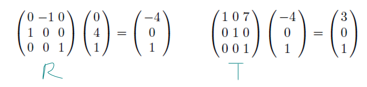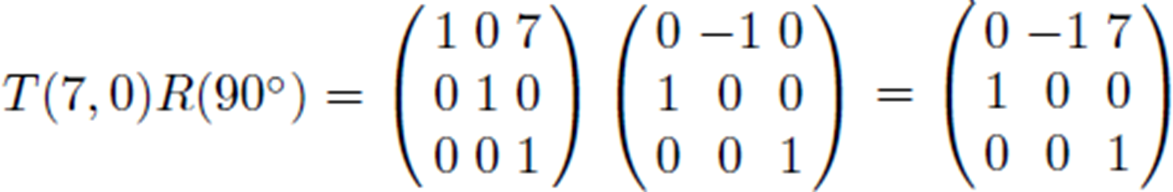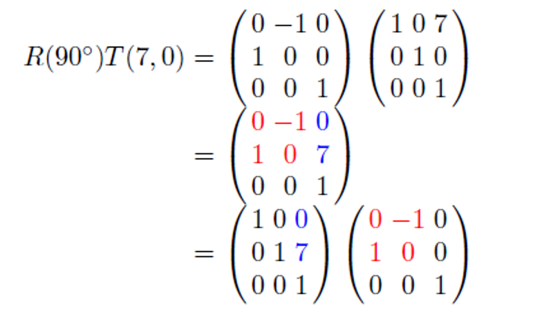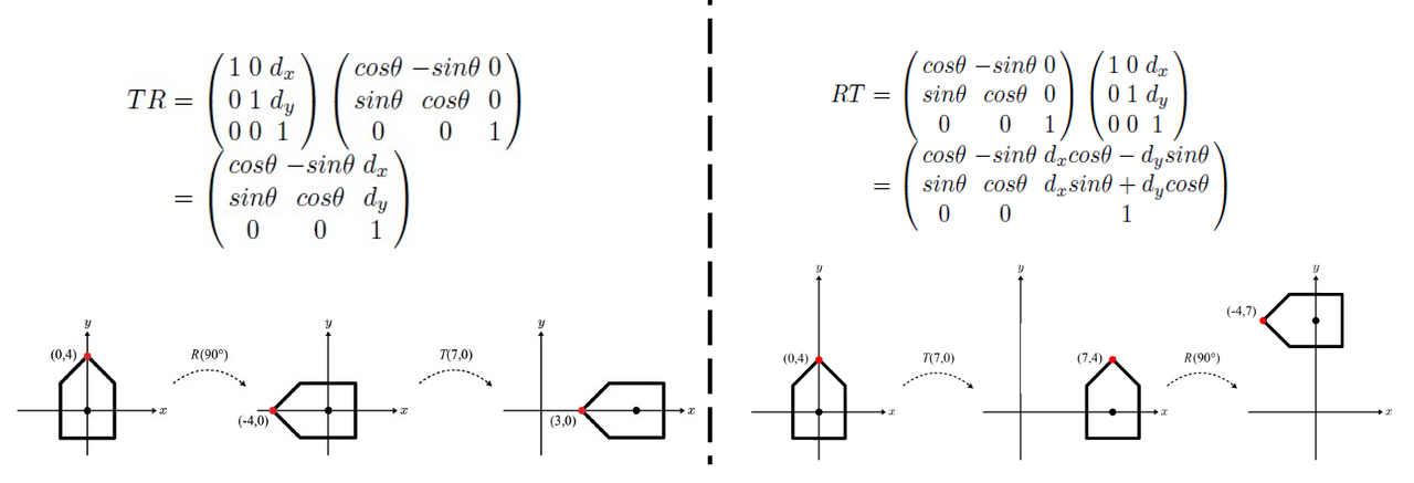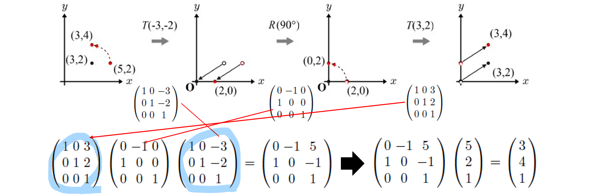 먼저 시행하는 변환을 뒤에 넣으면 된다. (열벡터 style일때 기준~ 당연함. 뒤에 위치한 변환 행렬이 좌표와 먼저 연산될 것이기 때문.)