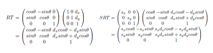 아핀 변환의 예시로는 다음과 같이 RT, SRT 등이 있을 수 있겠다.