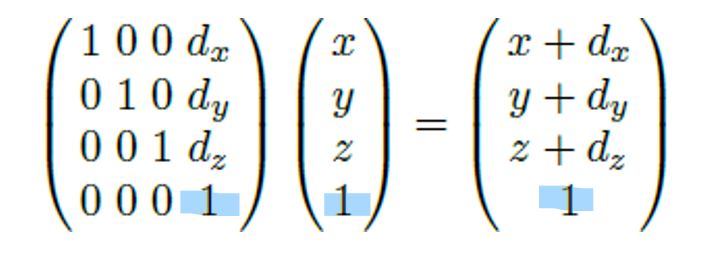 앞서도 언급했듯이, Translation은 기본적으로 곱셈이 아닌 덧셈으로 표현된다. 3D Translation에서도 동일하다.