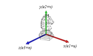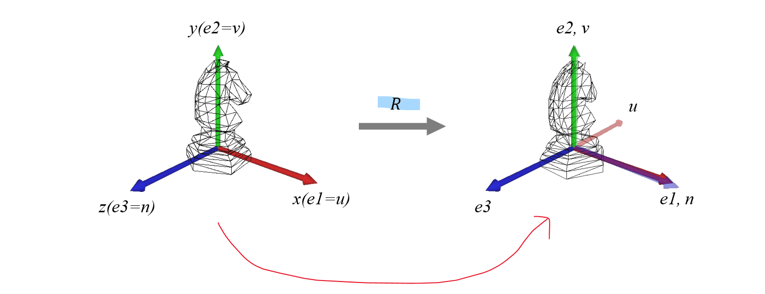 처음에 그냥 object를 만들면 두 space의 기저들의 방향이 각각 동일할 것임. (e1 = u, e2 = v, e3 = n)