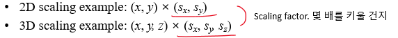 - Uniform Scaling : 세 Scaling factor가 같은 값인 경우. x, y, z축을 같은 비율로 늘리는 것을 의미함.