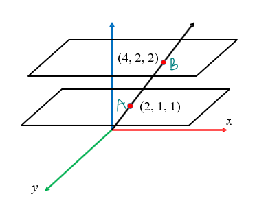 그림에서 A와 B는 동차 좌표계 위에 있다. (같은 벡터 위에 있음)