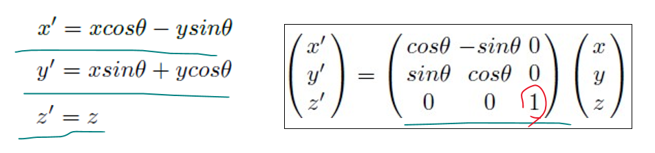 적용하면, z축 중심 회전은 위와 같이 표현할 수 있음!