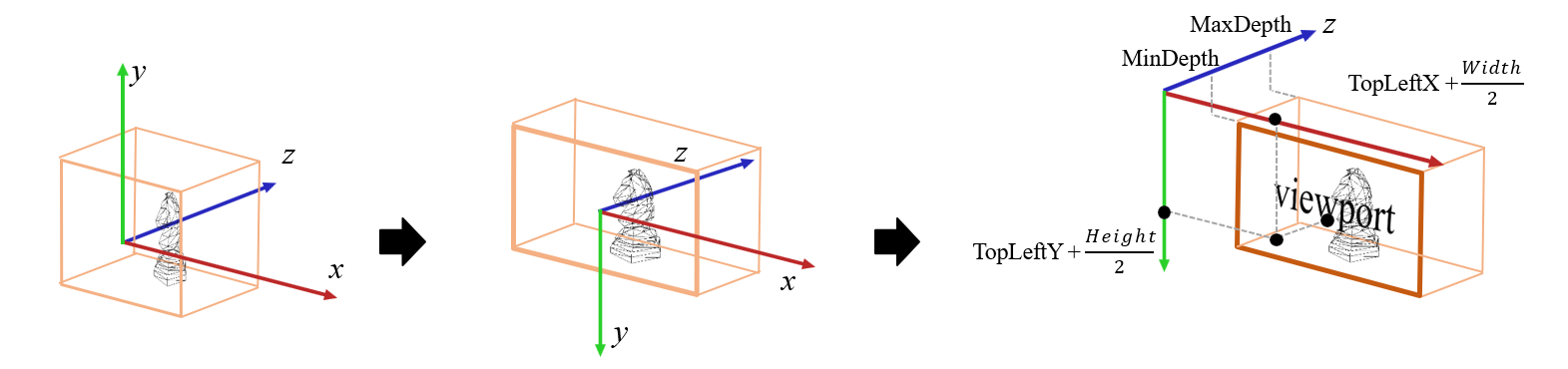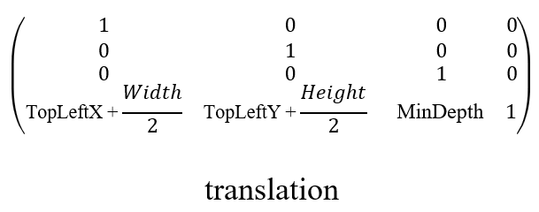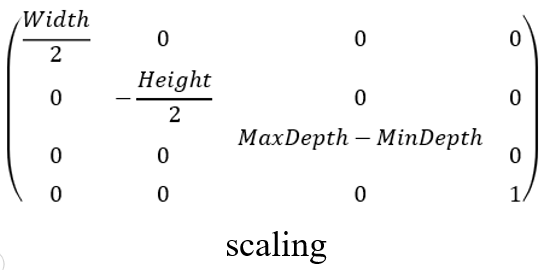 이 변환을 마치면, 2x2x1짜리 NDC space가 wxhx(MaxDepth-MinDepth)로 scaling된 것!