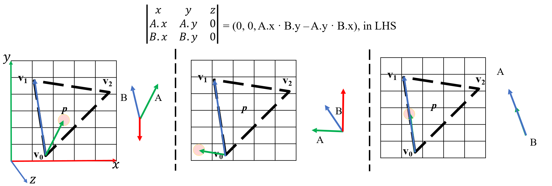 어떤 점이 세 개의 엣지 벡터를 기준으로 모두 오른쪽(positive를 반환)에 있다면, p는 삼각형 안에 있다고 할 수 있음.