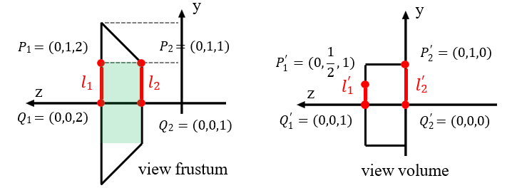 이전에 projection transform을 통해서 2x2x1 size의 clipping volume(Clip space)으로 이동되었다.