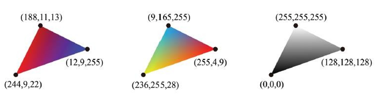 삼각형 내부의 어떤 점 p의 속성들(color, depth, texture, normal, ...)은 삼각형의 세 vertex들의 속성들을 보간(interpolate)해서 얻을 수 있음