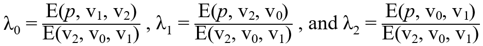 가중치 좌표 (λ0, λ1, λ2)는 각각 마주보는 트라이앵글 (T0, T1, T2)의 영역과 비례한다.