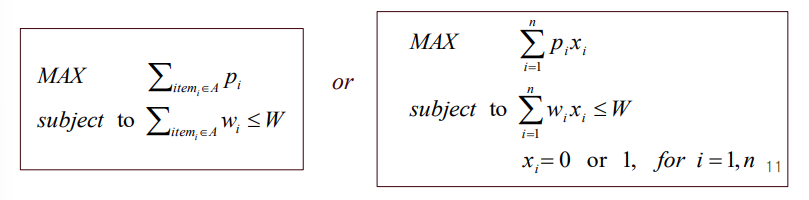 가방에 들어있는 물건들의 가치인 pi 합이 최대. 무게인 wi 합은 W를 넘지 않도록.