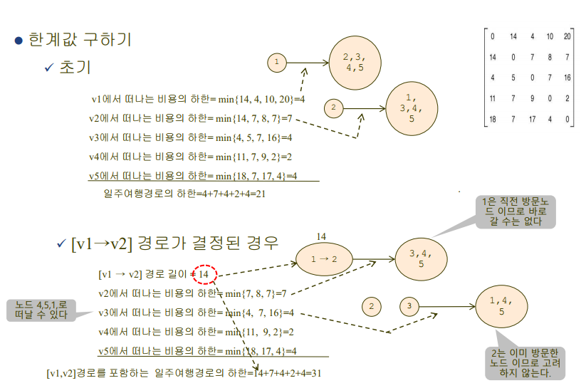 이런식으로 일주 여행경로의 하한값(이론상 최솟값)을 업데이트해나가면서 최단 경로와 비용을 구함.