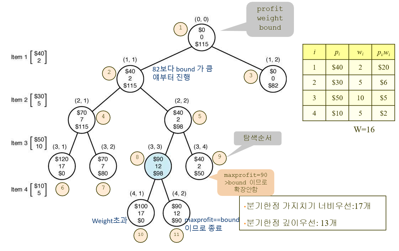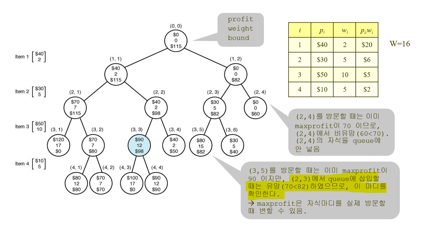 ✓ bound ≤ maxprofit 이면 수준 i에 있는 마디는 유망하지 않다. (같은 경우에도 굳이 그쪽으로 갈 필요 없음)