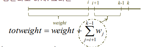 우선, 마디가 수준 i에 있다고 하고, 수준 k에 있는 마디에서 총무게가 W를 넘는다고 하자. 그러면 안 쪼개고 최대한 넣은 weight의 합(totweight)는 다음과 같다.