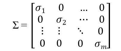 Σ: m×n 크기의 직사각형 대각행렬(rectangular diagonal matrix)로, 대각선에는 σi가 존재합니다.