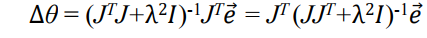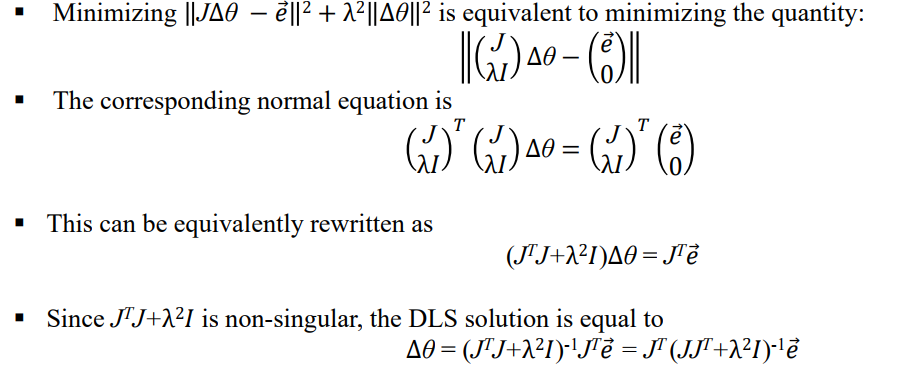 - DLS에서는 단순히 J∆θ - 𝑒를 최소화하는 ∆θ를 찾는 게 아니라, || J∆θ - 𝑒 ||² + λ²||∆θ||²를 최소화하는 ∆θ를 찾는다.