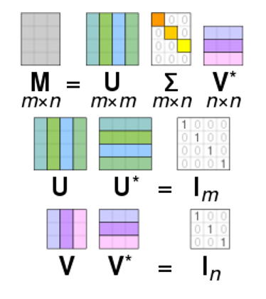 m×n 행렬 A의 SVD(Singular Value Decomposition)는 다음과 같은 공식으로 표현됩니다: A = UΣV*