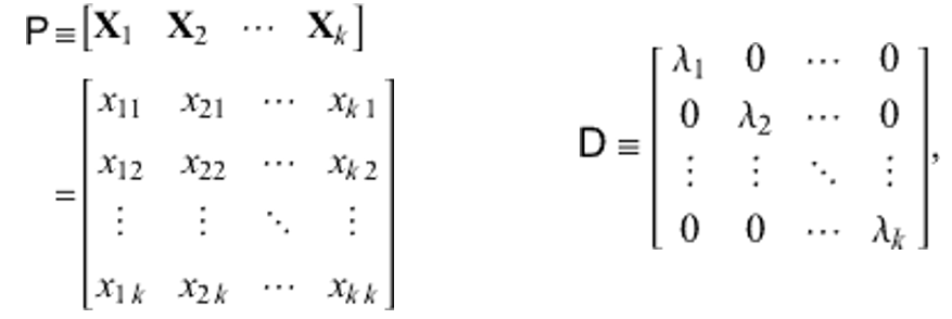 이로부터, 다음과 같이 eigen vector들의 행렬인 P와, 대각 성분으로 eigen value들을 갖고있는 행렬 D를 정의할 수 있습니다.