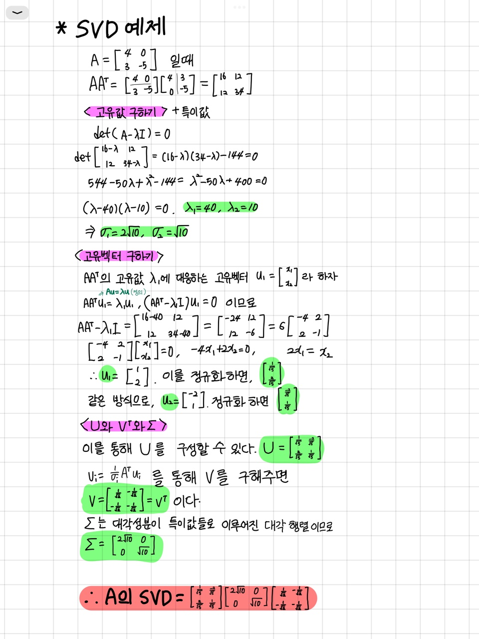 2) AAT에 λ를 넣고, { x1, x2 } 랑 곱해서 0이 나오도록 하는 x1, x2를 찾는다. 그리고 정규화해서 U에 넣는다.