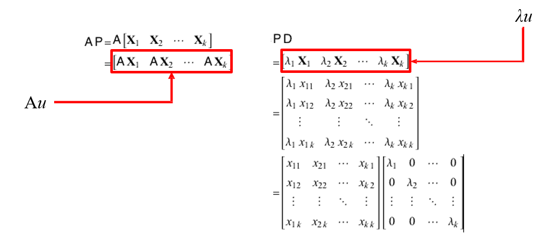 정사각 행렬 A를 고유값과 고유벡터로 분해해서 표현한 것. AP = PD. A = PDP⁻¹