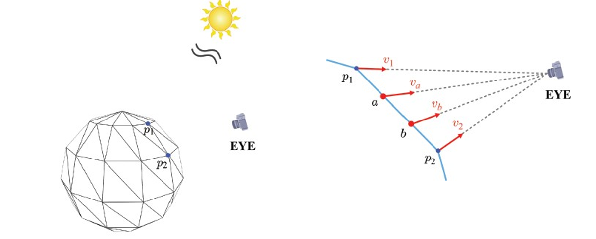 Object의 표면 위에, 개별적인 픽셀로 구성된 두 지점이 있다고 하자.