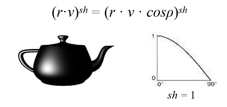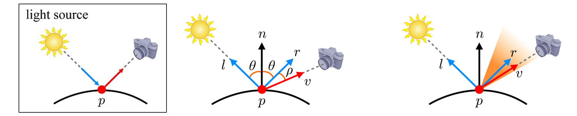 - reflection vector r과 view vector v사이의 각 ρ가 0에 가까울수록, 내눈에 더 세게 보임.